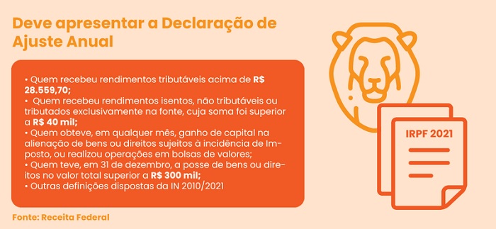 Segundo a Instrução Normativa n° 2010/2021, é obrigado a apresentar a Declaração de Ajuste Anual, a pessoa física que, em 2020, recebeu rendimentos tributáveis acima de R$ 28.559,70; quem recebeu rendimentos isentos, não tributáveis ou tributados exclusivamente na fonte, cuja soma foi superior a R$ 40 mil; quem obteve, em qualquer mês, ganho de capital na alienação de bens ou direitos sujeitos à incidência de Imposto, ou realizou operações em bolsas de valores; quem teve, em 31 de dezembro, a posse de bens ou direitos no valor total superior a R$ 300 mil; entre outras definições dispostas na IN.