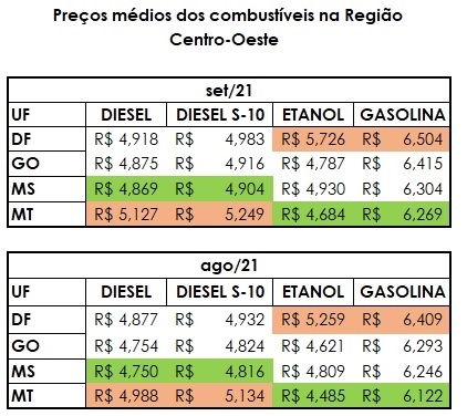 No recorte por estado, no Mato Grosso, tanto o etanol quanto a gasolina foram encontrados pelos preços médios mais baixos da região, a R$ 4,684 e R$ 6,269, respectivamente. Diferente de quando são analisados os valores por litro do diesel: o tipo comum, a R$ 5,127, e o S-10, a R$ 5,249, foram os mais caros do Centro-Oeste no estado.